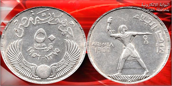 عملة تذكارية فئة خمسون قرشاً من عصر الرئيس الراحل جمال عبد الناصر بمناسبة عيد الجلاء عام 1956