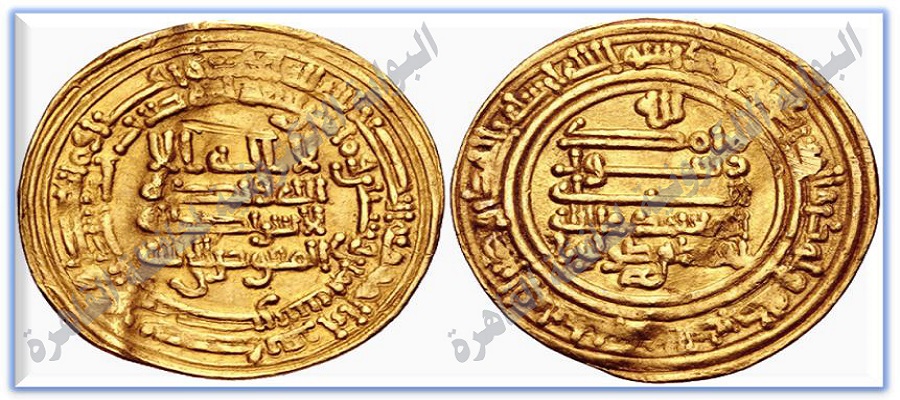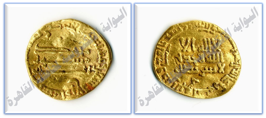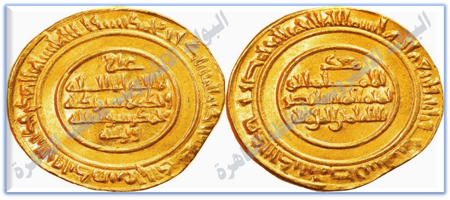 والهامش الخارجي: بسم الله ضرب هذا الدينار بمصر سنة ستين وثلثمائة.